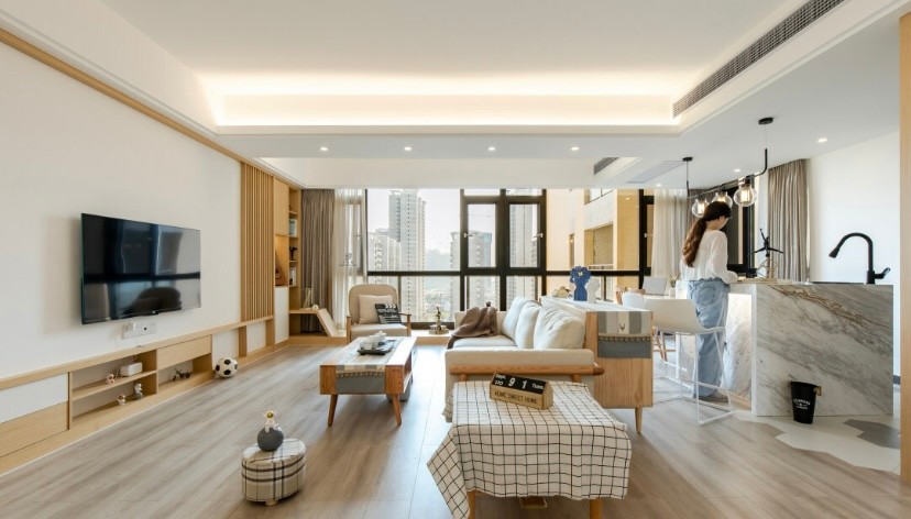 设计理念:本案以日式基调贯穿整体,原木色与白色相辅相成,浅灰色系点缀空间,简洁自然没有繁杂的装饰,将日常生活以敞开的方式,打造更轻松自在的生活空间。