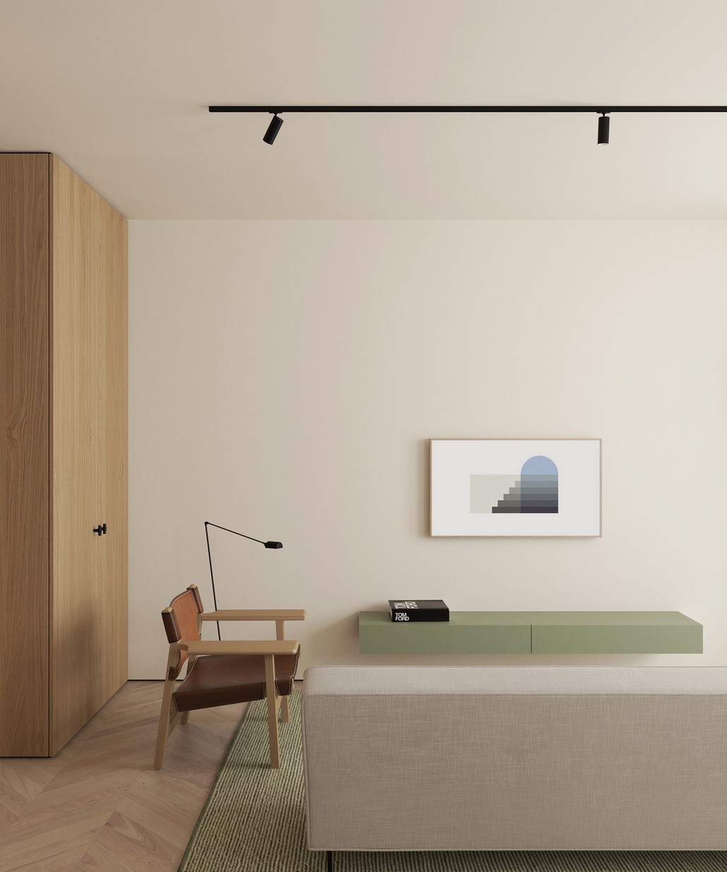 客厅的设计很简洁 绿色的地毯、壁柜、灰色的沙发 材质和色彩这样搭配更为契合 顶部的黑色射灯和单人椅边的落地灯 与整体柔和色调形成鲜明对比
