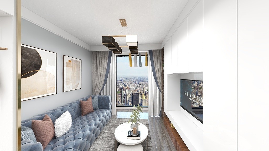 客厅背景浅灰色乳胶漆,蓝色布艺沙发,定制通体电视柜,整体大气又同时满足储物需求