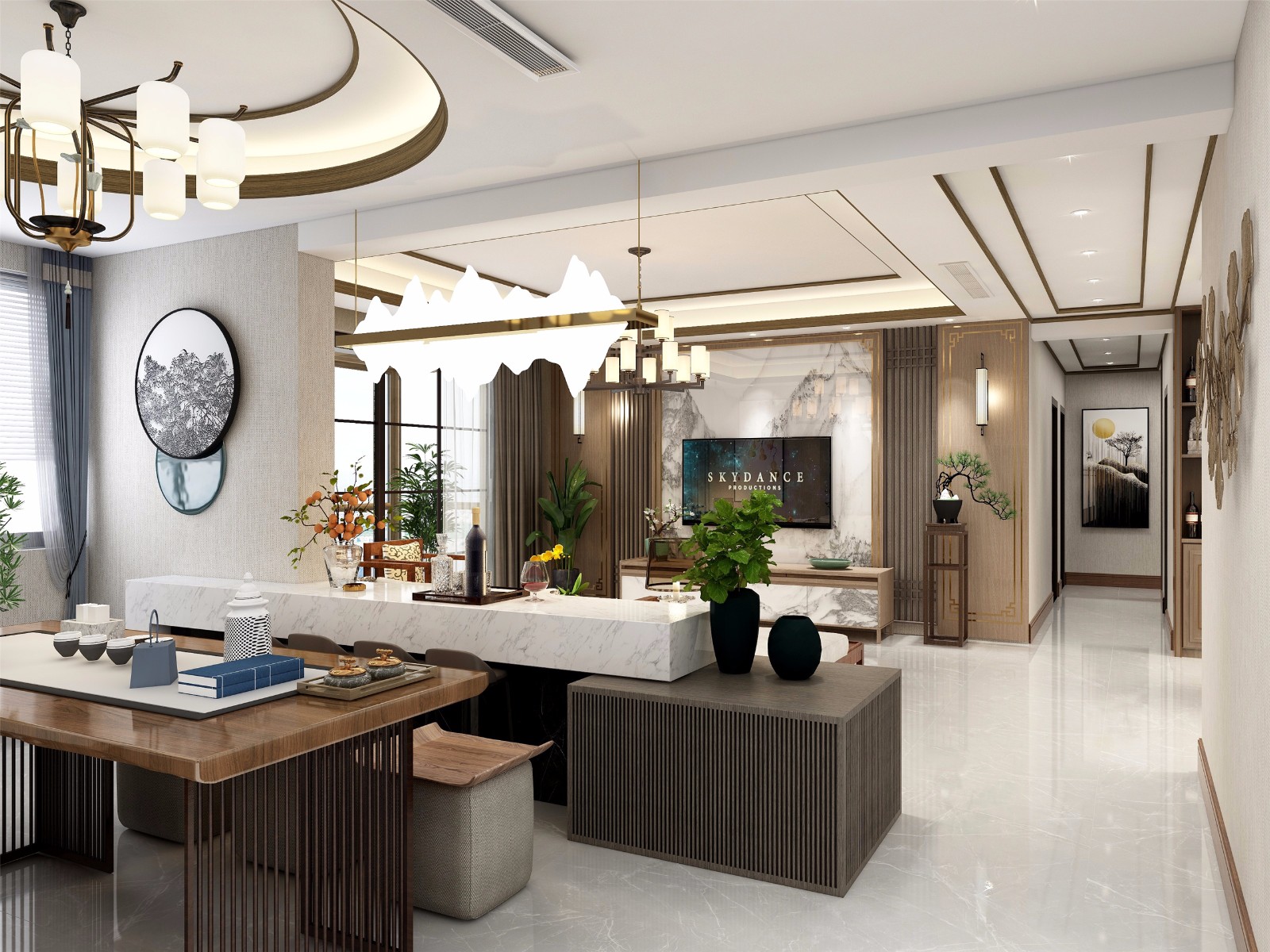 全屋新中式造型,实木搭配现代风格的石材元素,统一色调。石材木材带来的***质感,既有中式的文化韵味,还有现代生活的气息。