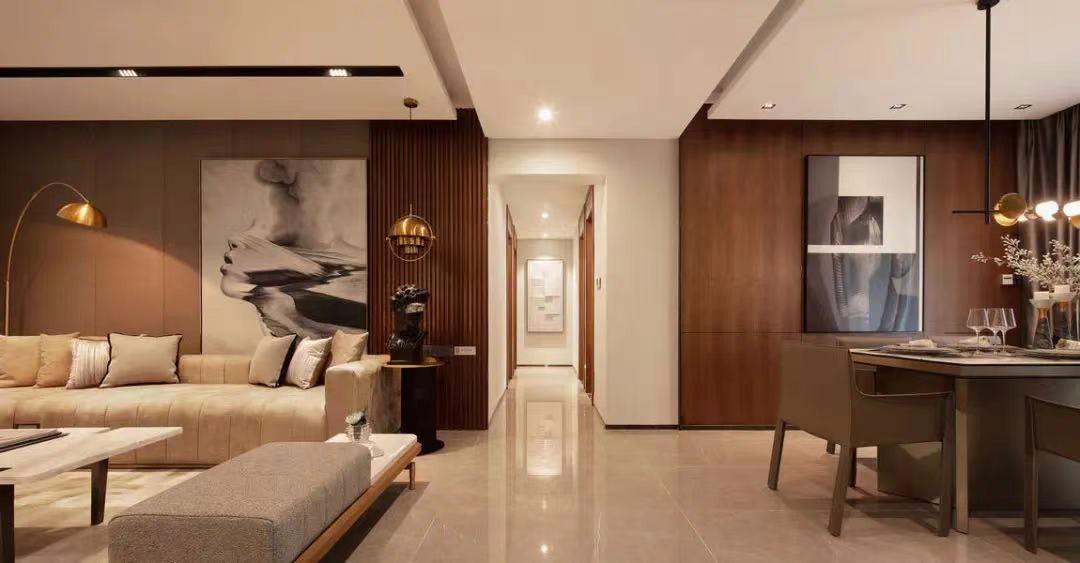 客厅与餐厅空间相邻的设计,整个大厅区域的墙面加入了较多的胡桃木材质,让空间显得更加稳重端庄而***。