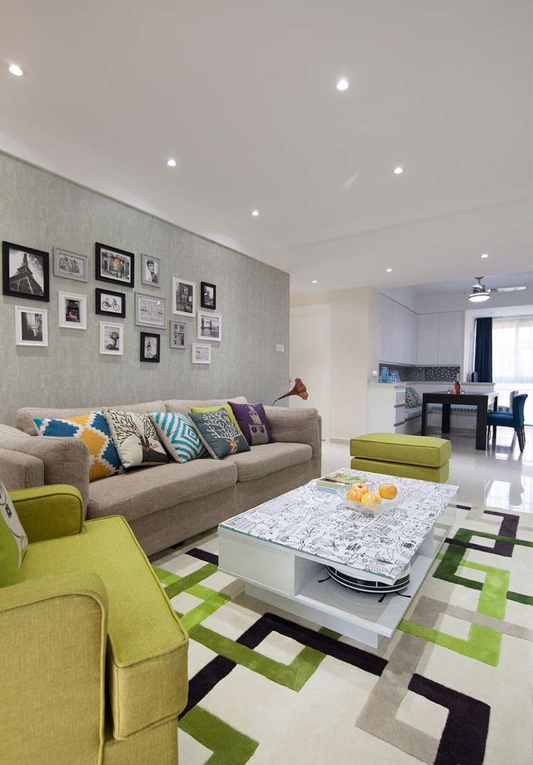在颜色上整体采用灰色,用绿色的沙发来撞色