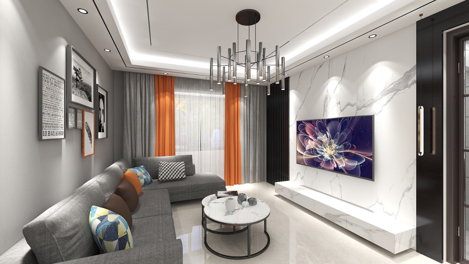 客厅墙面浅灰色壁布木饰面电视背景墙