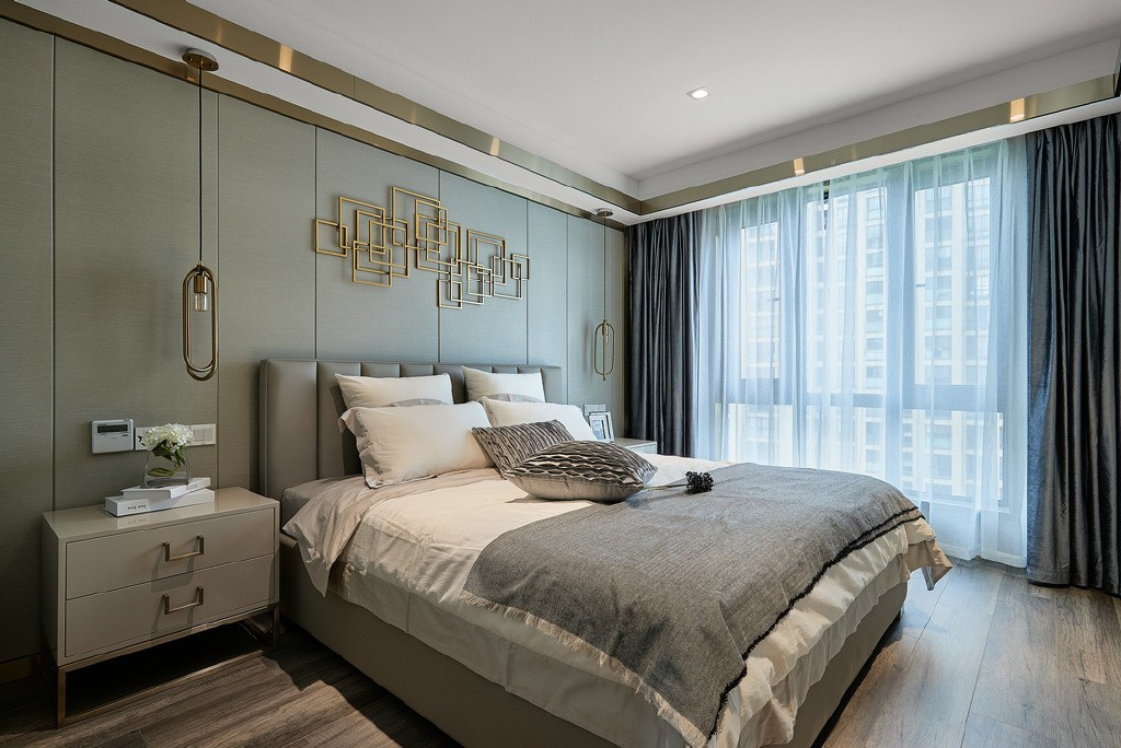 次卧背景墙加了金属挂件,精致了许多