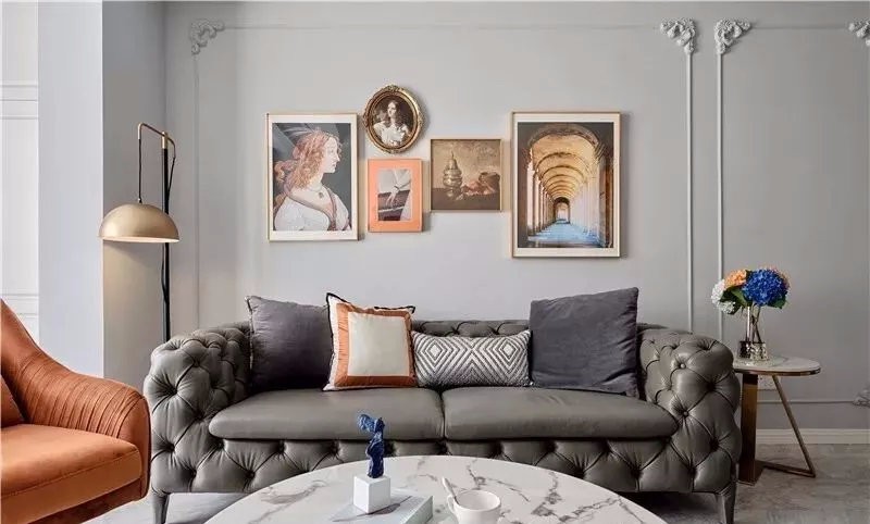 客厅沙发墙,***灰为主,搭配一些法式图案的挂画,整个简约唯美,又充满浪漫气息。