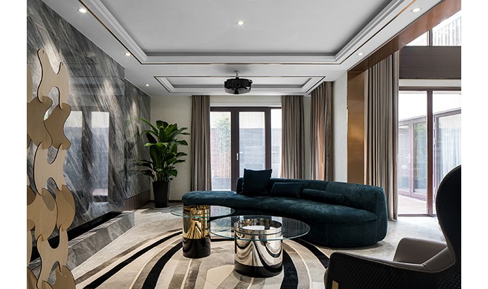 负一楼会客厅的背景采用深色大理石和木饰面拼接,凸显视觉空间感,底部嵌入3D雾化火焰电子壁炉,给寒冷的冬天增添温馨的暖意,同时会客厅还配备了智能家庭影院,打造出业主的专属空间,随心进行娱乐活动,轻松愉悦的享受一场视觉盛宴。