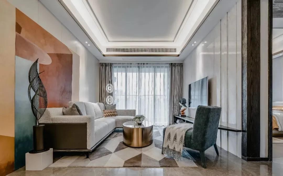 沙发墙在硬包基础,加入一幅颜色鲜艳的大尺寸装饰画,靠放一张灰色布艺沙发,地面也是加入棕褐色的几何图案地毯,搭配一张蓝色休闲椅,整个空间给人的感觉就是从容舒适。