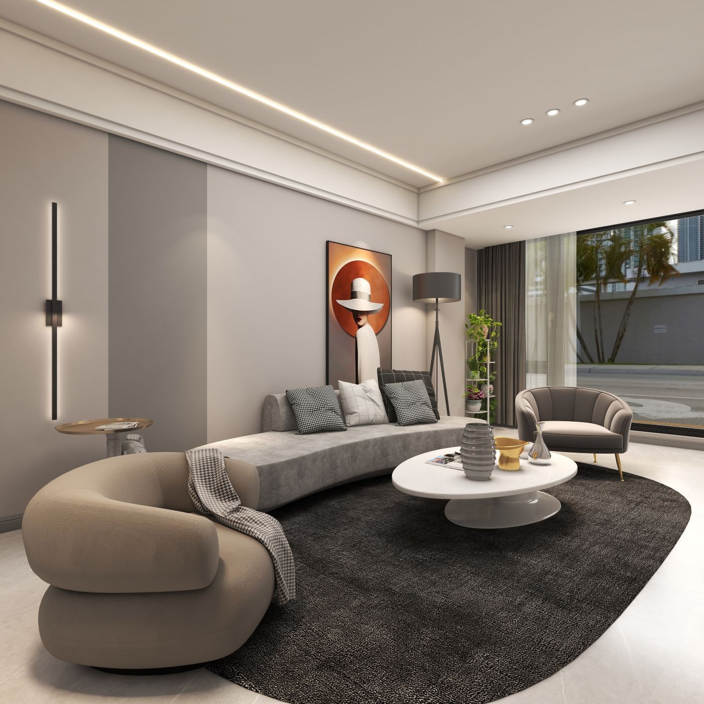 懒人沙发、异形沙发、柔软的地毯、异形茶几,整体营造一种简单却不简约的精致感。