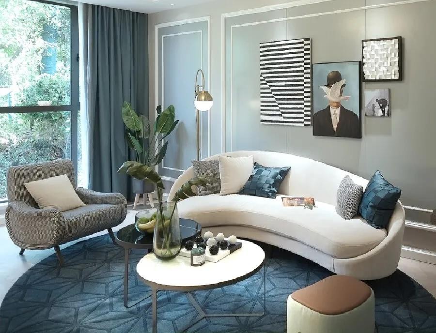 沙发墙挂上一组时尚的装饰画,搭配弧形沙发,还有双拼黑白配的圆茶几,边上一张自然舒适的休闲椅,整个空间都显得充满着时尚优雅的舒适体验。