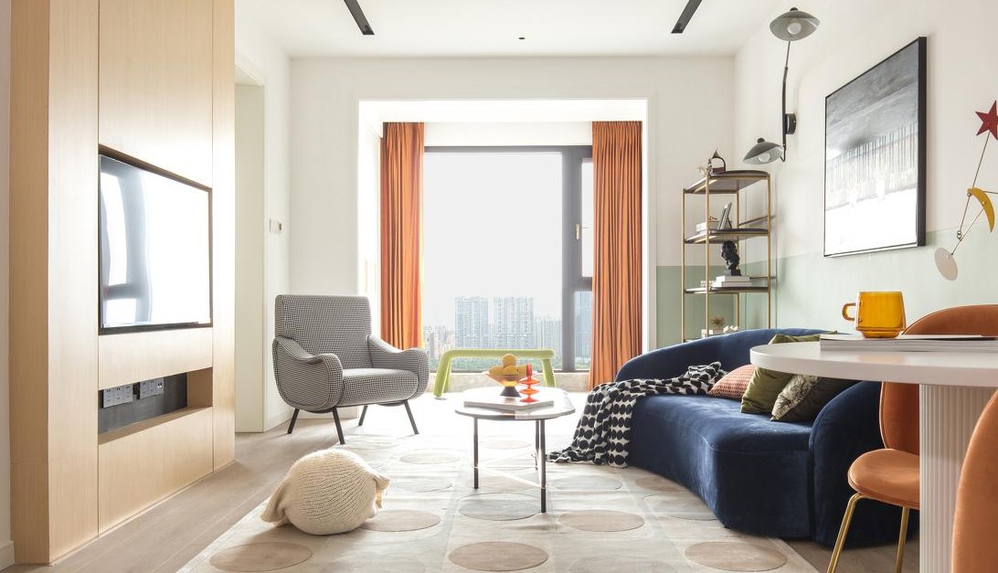 和空间主色调相搭,客厅也以白、为主色调,配以蓝橘相呼应,每一处角落都传递着自由、灵动且舒适的空间感。