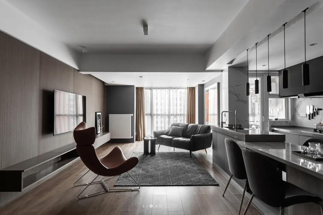 客厅空间现代朴素,整个客餐厨都是在一个大大的开放区域内,大方随意的空间布置,让空间充满时尚端庄的***感。