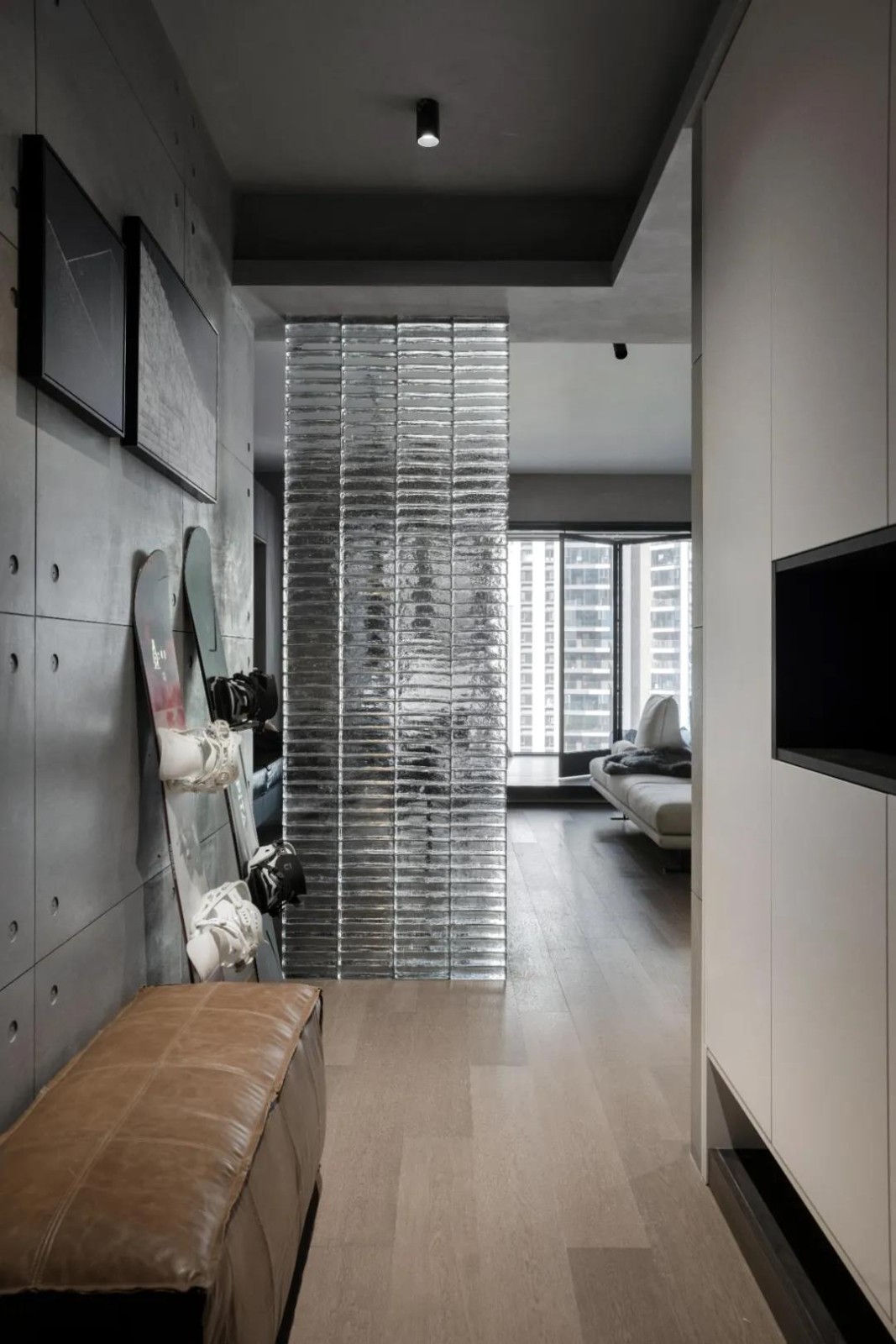 进门玄关保留右侧的立柜,重新做了白色的柜门,跟整体空间融合,利用玻璃砖作隔断,增强客厅的隐私性,提升空间通透度,半虚半实。