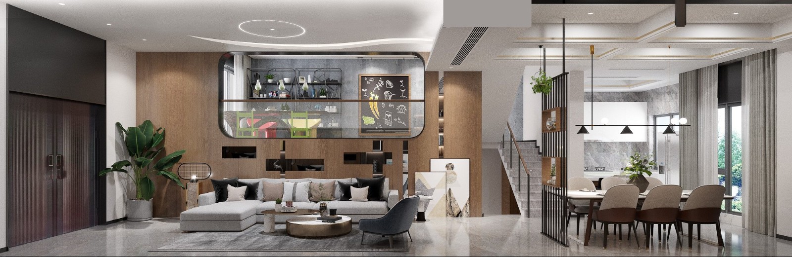 成长型家庭,2岁大宝与1岁小宝的生活早教,情感互动与爱的传递,需开阔舒适。 起居室:满足5-6人的相聚/观影。互动区:扩大原楼梯处开口,完全开放,设展示和收纳柜、水平大桌。或手工、或学习、或茗茶、或阅读.....餐厅:满足6-8人就餐。