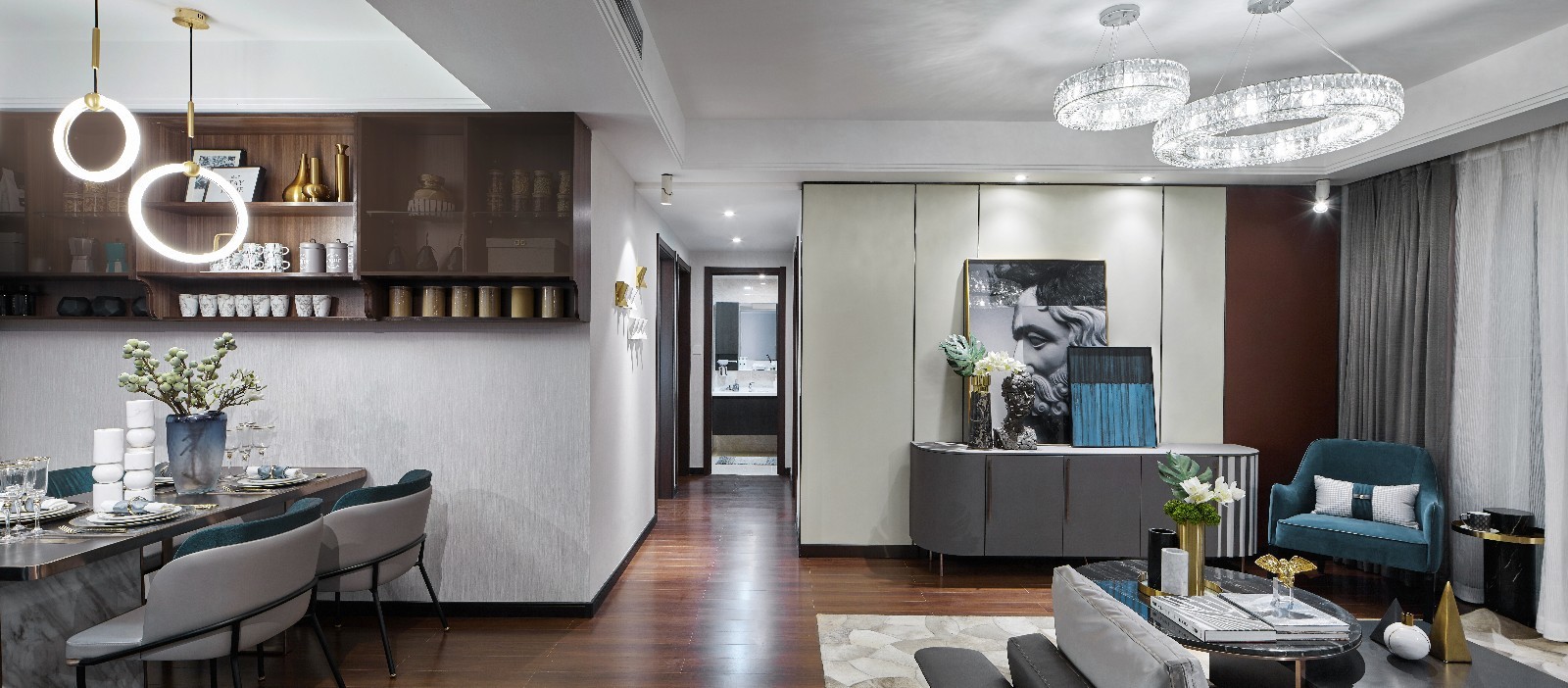 对于居所,每个人都有着自己独到的喜好和见解!本案设计师通过简单的线条勾勒出低调轻奢的风骨,干净的白、海水的蓝,色彩搭配上烘托浪漫雅致与舒适融合的气质。柔软的地毯,更多的温馨融合。