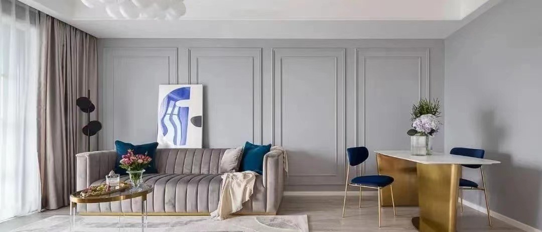 改造后的客厅融合临近空间,成为采光通透的大空间,灰调做为空间的主色调,湖蓝色点缀其中,让空间彰显更精致的时尚气息。