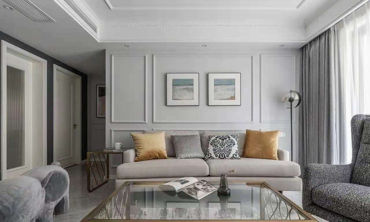 石膏线背景墙简约大气,搭配布艺沙发毫无违和感