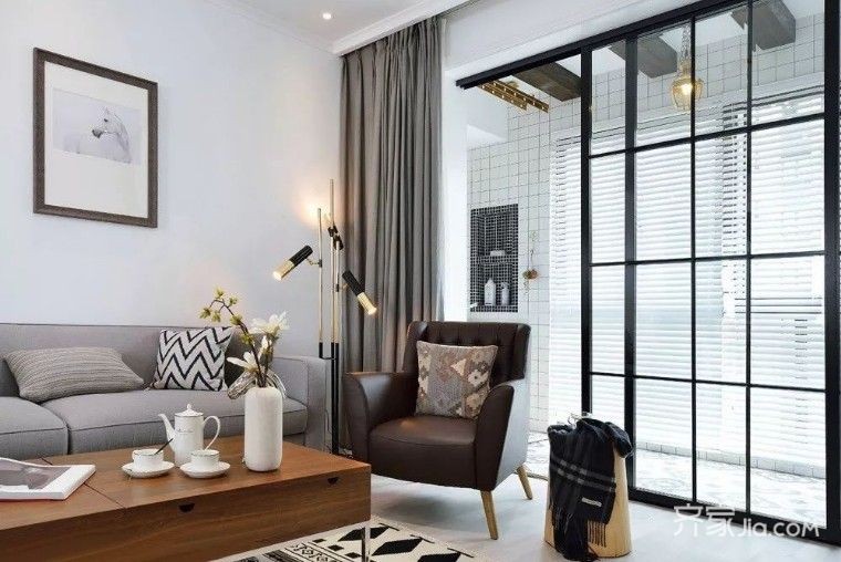 浅灰色的布艺沙发配上几何图案的抱枕、地毯,整体上舒适自然。木质茶几沉稳而有质感,充满情调的装饰摆件自然有格调。
