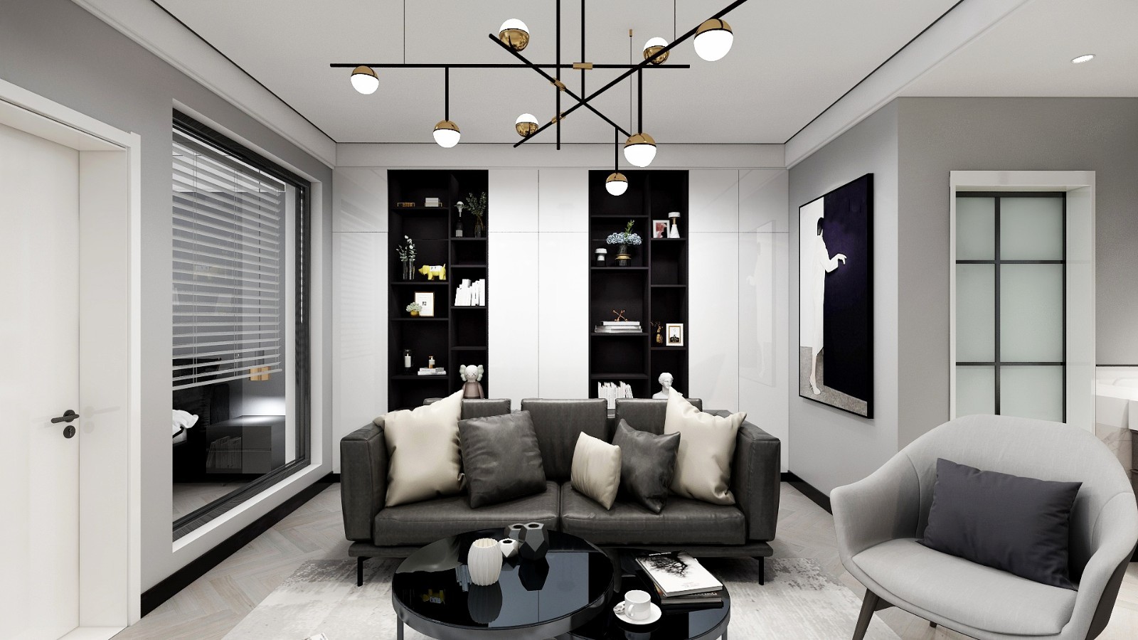 整体采用冷色调,***灰色乳胶漆、灰***字拼地板、黑色皮质三人沙发,造型极其简单的茶几,灰色纹理地毯,完美的诠释出整体风格,很大的提升了主人的品味。