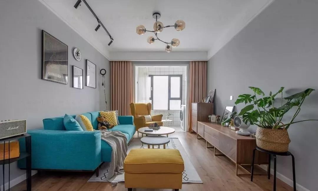 客厅与阳台连通,延展空间视觉增加采光,地面通铺木色地板,与肉粉色窗帘为公领域增添一丝温柔自然的色调