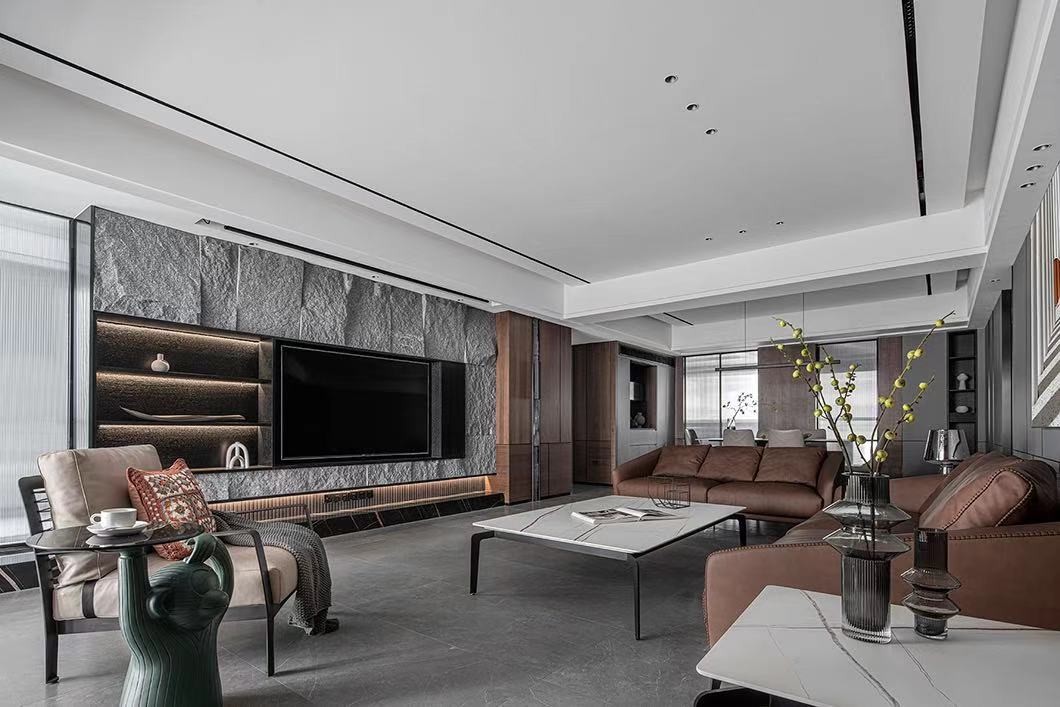 结合了房屋空间的特点,采用简约明朗的色块与线条、游走并贯穿了所有空间,渲染着石材的古朴与胡桃木的韵味,为业主量身打造了这一处自然气息与现代时尚风格交汇的私属区域。