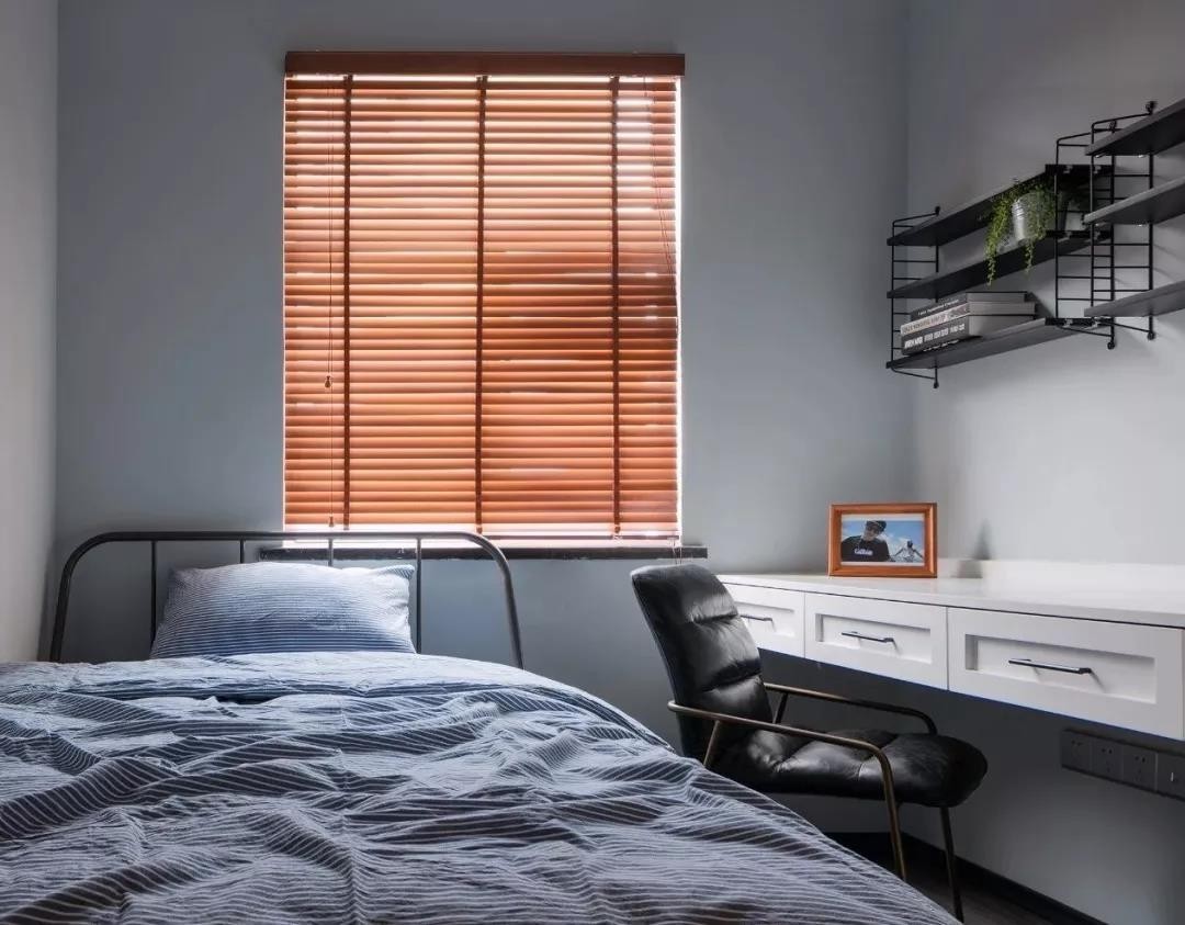 次卧选择铁艺单人床、铁艺搁板,配上百叶窗帘,呈现最简单的舒适感,现场制作的书桌摆放电脑、手办、绘画板,让卧室兼具书房功能