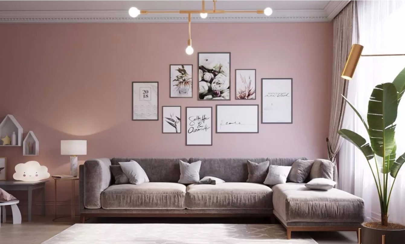 粉色和灰色撞色的墙纸简直把灰色和粉色的韵味搭配得恰好,三种灰色调递进排列,夹着着粉色的清雅可爱,整个墙面看起来特别和谐大气。搭配着粉色的布艺沙发和灰色的茶几,北欧气质立现。