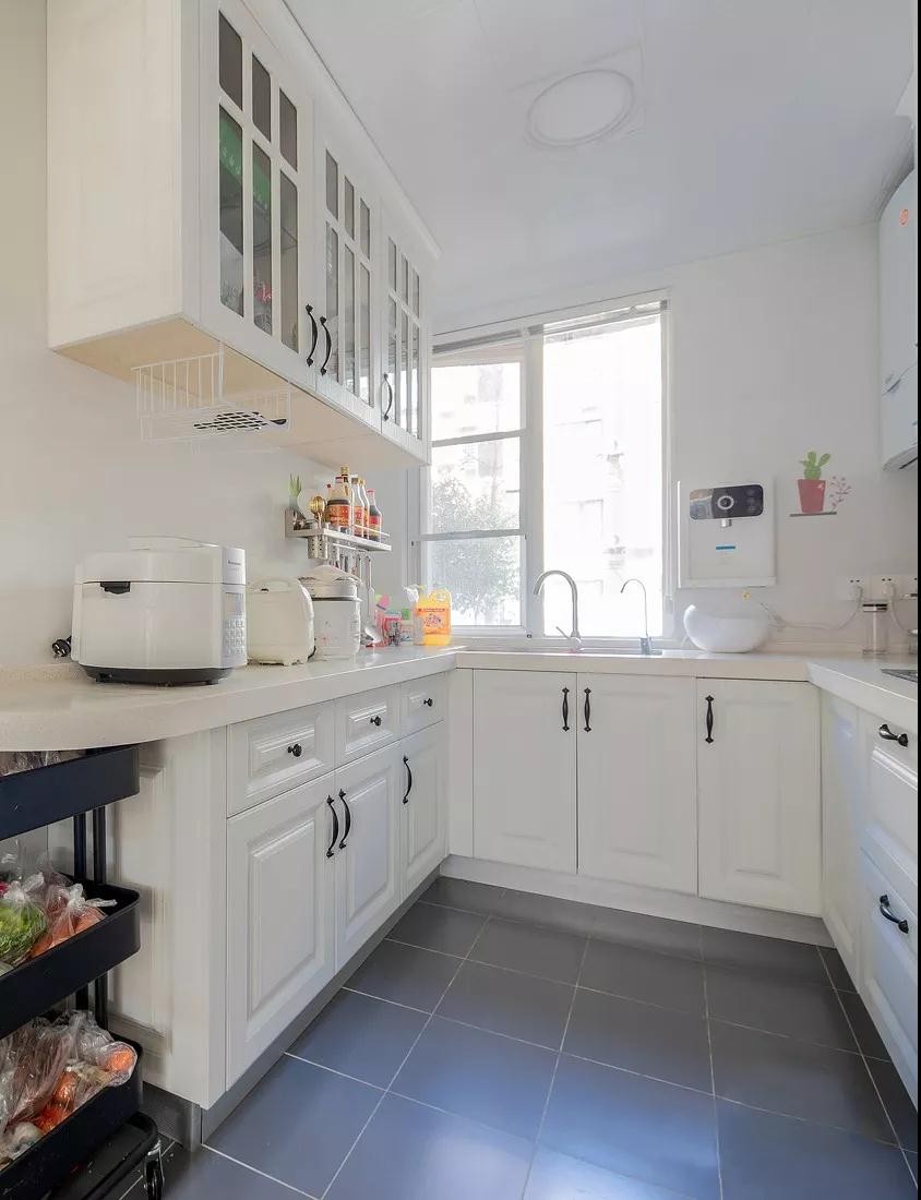 厨房以白色为基调,白色橱柜选用黑色把手作为点缀,丰富空间的层次感。
