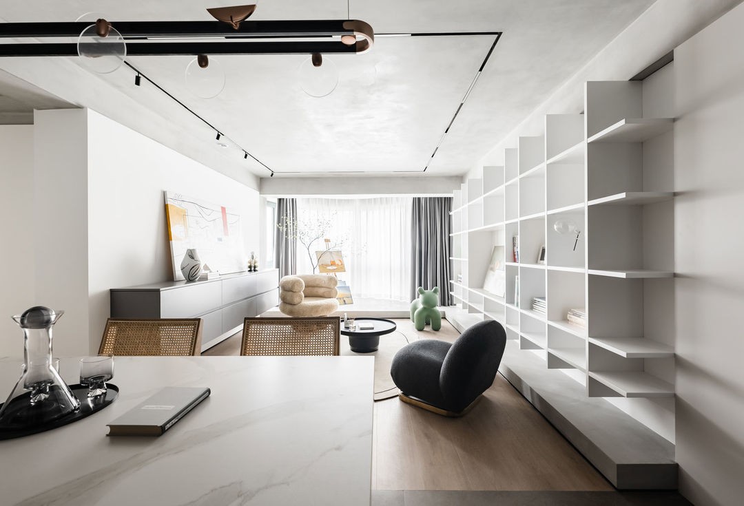 干净实用的下沉式玄关,入户右手边的磁吸白板墙、地台上的半弧形小阳台“无修饰”的收纳格背景墙、层次分明的微水泥吊顶、暗藏氛围灯的踢脚线、三分离式洗手间……等等。 做到处处细节见惊喜,最终不负“同行”所托,打造出这个质感与仪式感并存的家。