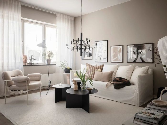 客厅的***印象是西面大大的双开窗,方便明亮又美丽的光线进入房间;整个空间都是奶茶色系,白色和裸粉色共同营造温柔浪漫的氛围; 大块白色地毯分隔出沙发区,对面就是开放式餐厨的区域,配备了冰箱、电磁炉、抽油烟机和烤箱。 厨房的操作台面是不锈钢,耐用性很好,和不锈钢冰箱搭配;防溅墙用黑色的小方砖铺贴,增添了现代酷感。