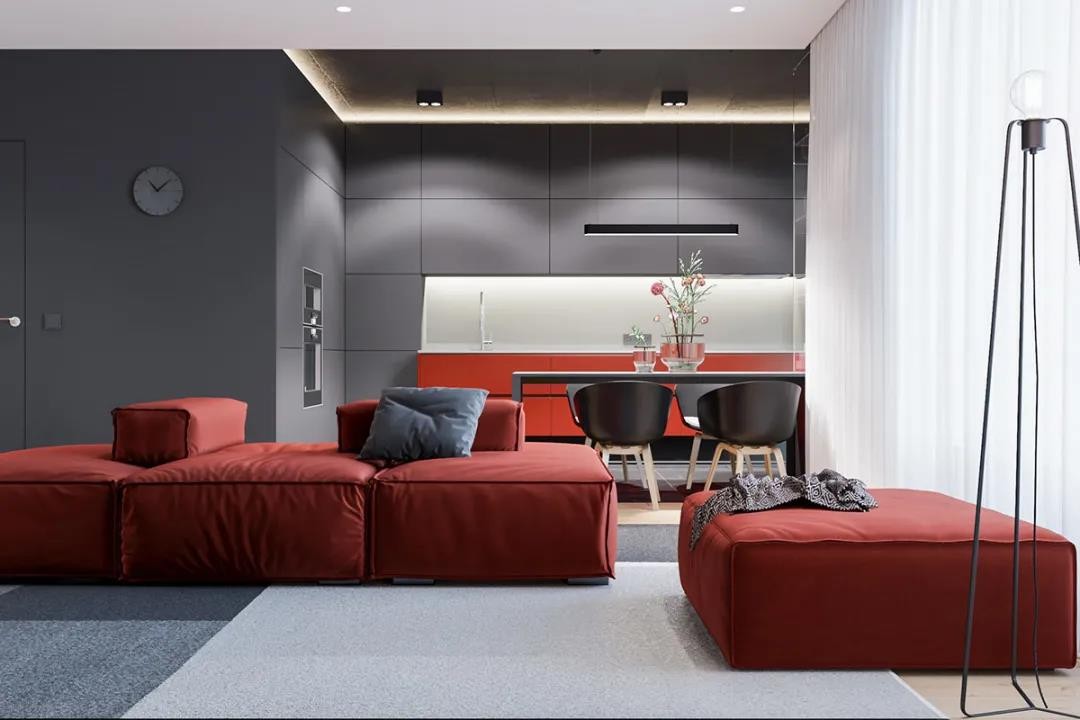 在这套88平米的房子中,整体空间采取极简风的设计,在大面积的***灰的空间下,加入了红色的家具与柜子等细节装饰,再以线性的无主灯灯带设计,使得空间装扮出时尚***的居住空间感。