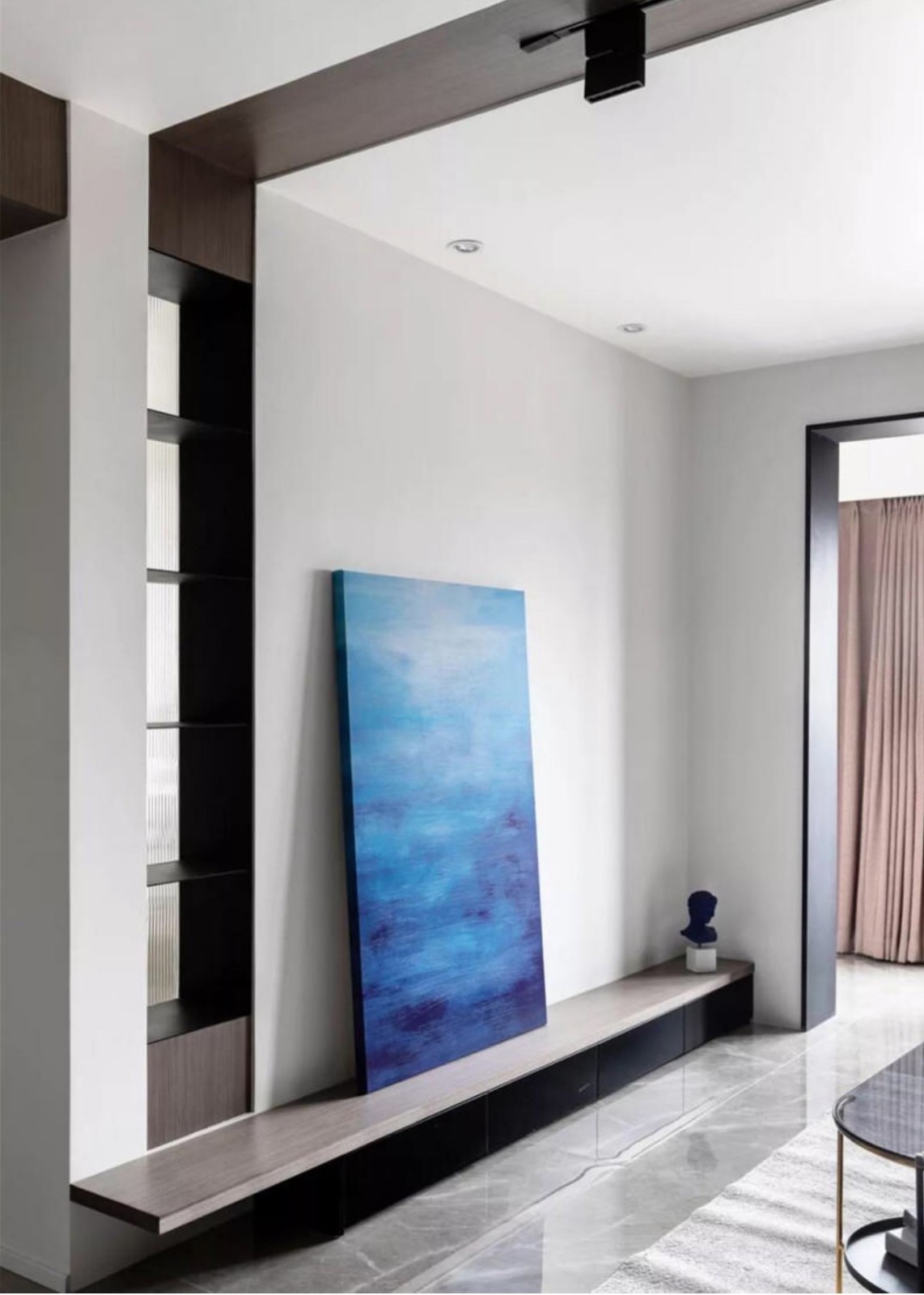 定制款电视柜,木纹台面搭配黑色柜体,一深一浅,层次分明,电视墙左侧与次卧打通装了长虹玻璃,并加了收纳柜和隔板,独特的设计美观与实用性兼具
