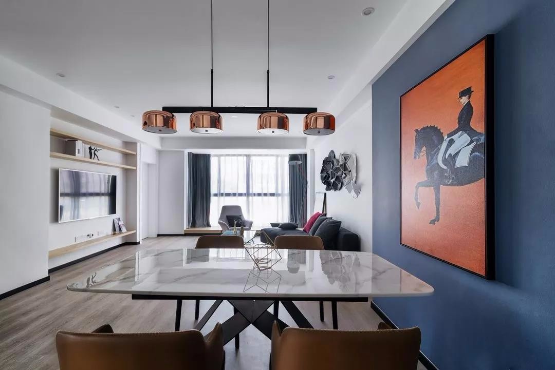 ▲餐厅角度,灰蓝色的墙面是整个餐厅的中心点,非常能抓住人的要求,配以橙色的装饰画,撞色的效果体现出来。从而产生更强的视觉冲击力。