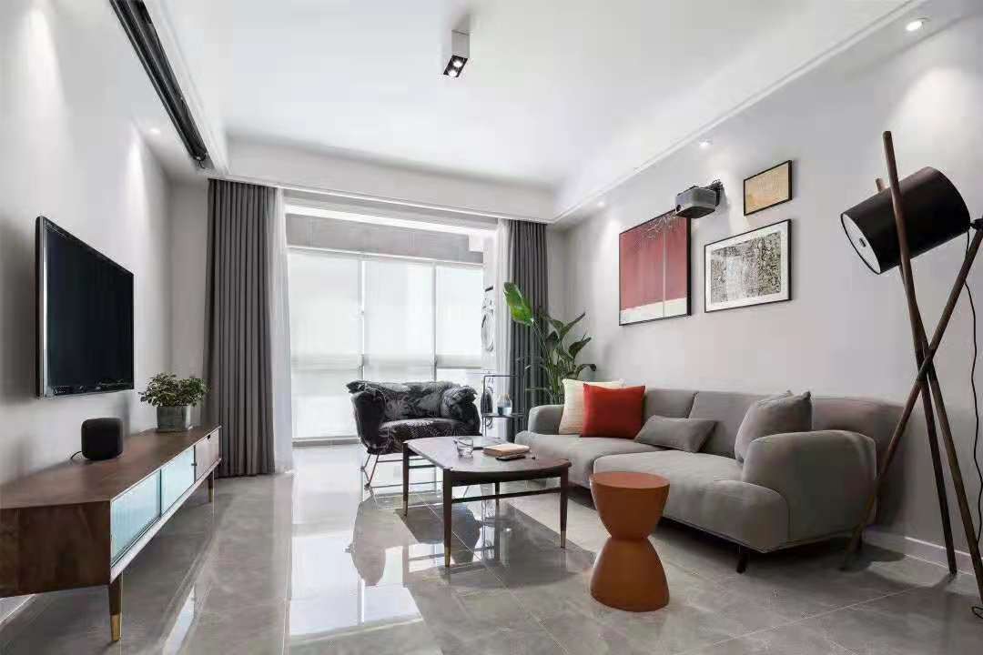 灰白主色,简约大气;家具配现代轻奢家具提升品质,背景挂画加投影,是主人最喜欢的