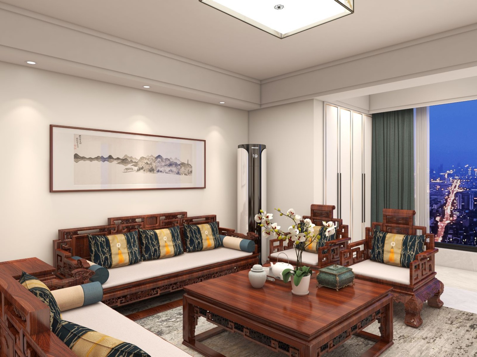 三加二红木沙发,在红木的沉重中,背景墙饰用山水画代替,恰到好处的调和了舒缓的气氛。