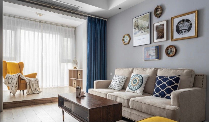 设计师巧妙的将整个客厅区域融合了美式+北欧风格,石膏线造型的电视背景墙,简单线条凸显美式经典风格;用软装(茶几、电视柜)彰显北欧传统样貌。