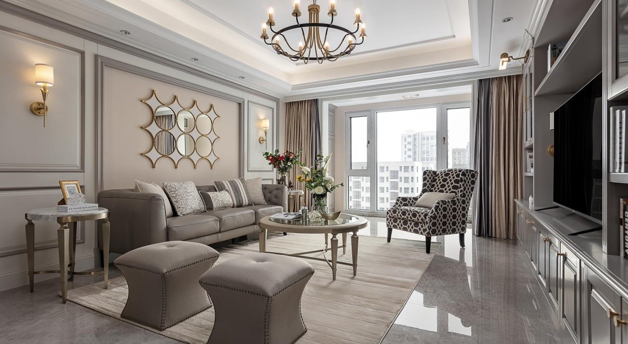轻奢风的古典银镜,装饰着整个空间,起到了点睛之笔的作用,流畅的铁艺线条呈现着生活的品味,既时尚又可以增加室内的光线感,拓宽视野,让客厅看起来更加通透宽敞。