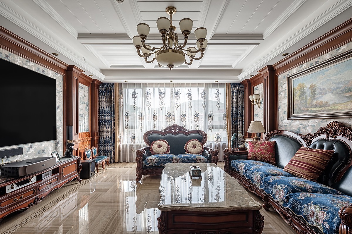 历经八遍地细致打磨,大理石结晶地面在做到防滑、防水、防油的同时增强了色彩和光亮度,将早晨九点的朝气蓬勃永远贮存在目光可及的每一寸空间。繁复的纹绣附着在薄纱上,使得整个客厅光鲜明快又有着浓厚的古典气息,成就了独属于美式的复古浪漫。不论是男主人合作伙伴的到访还是女主人同挚友的下午茶时光,都可在此宾友尽欢。