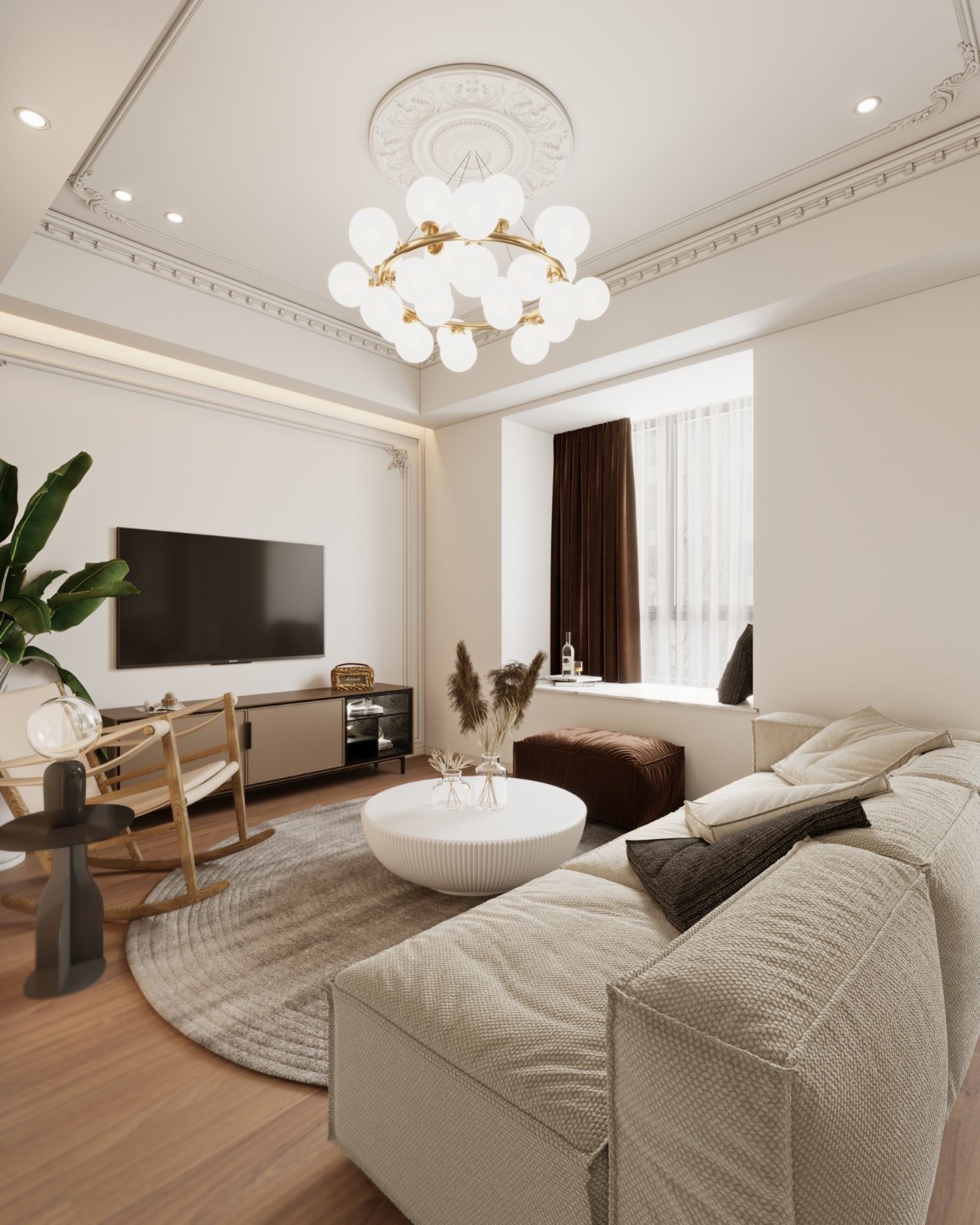 穿插重点照明灯光。让整个一层看起来更为通透和整洁。花砖的设计让空间不失活泼。辅以绿植和布艺点缀,舒适温馨