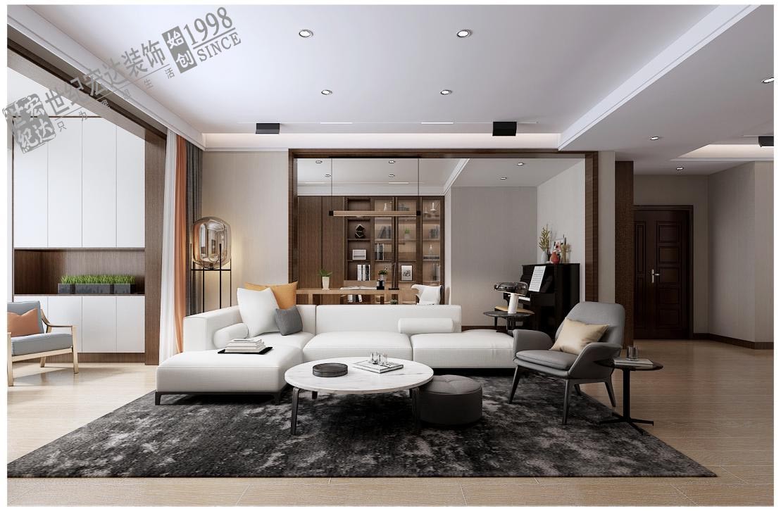 客厅采用白色沙发,与整个空间协调,给人一种舒适感,沙发后面的书房与客厅融为一体,使整个房间增大一倍,视野上更加开阔。
