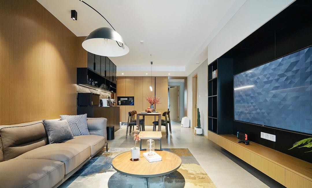 木质墙板延伸至客厅空间,大面积木色与黑色的穿插搭配,让空间整体不显得单调