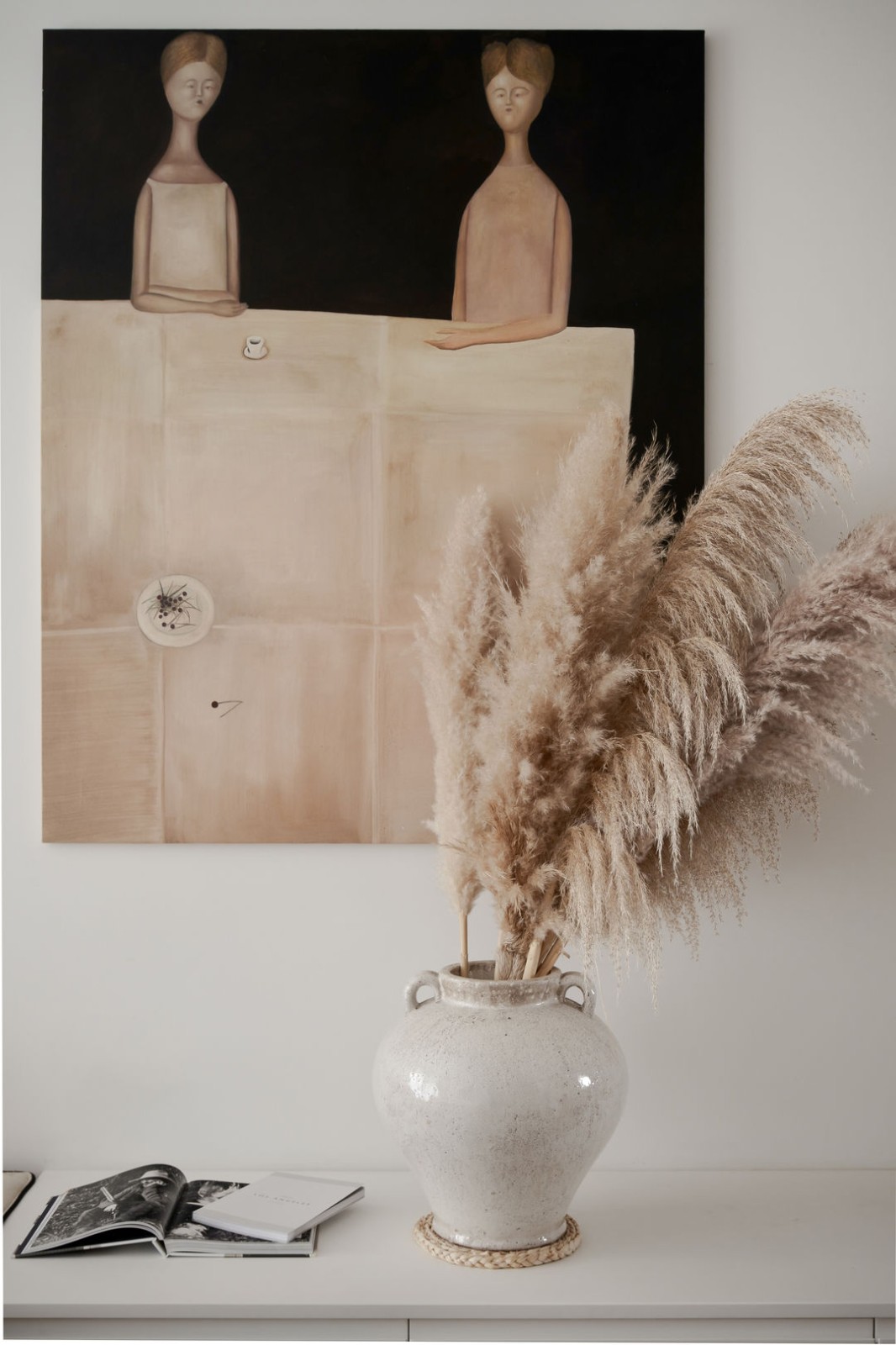 客餐厅的背景没有任何复杂的处理,极左是一盏垂钓的锥形灯,极右是拱形储物柜,介于之间是来自意大利画家安东尼 · 布埃诺(antonio bueno)的作品——《交谈》