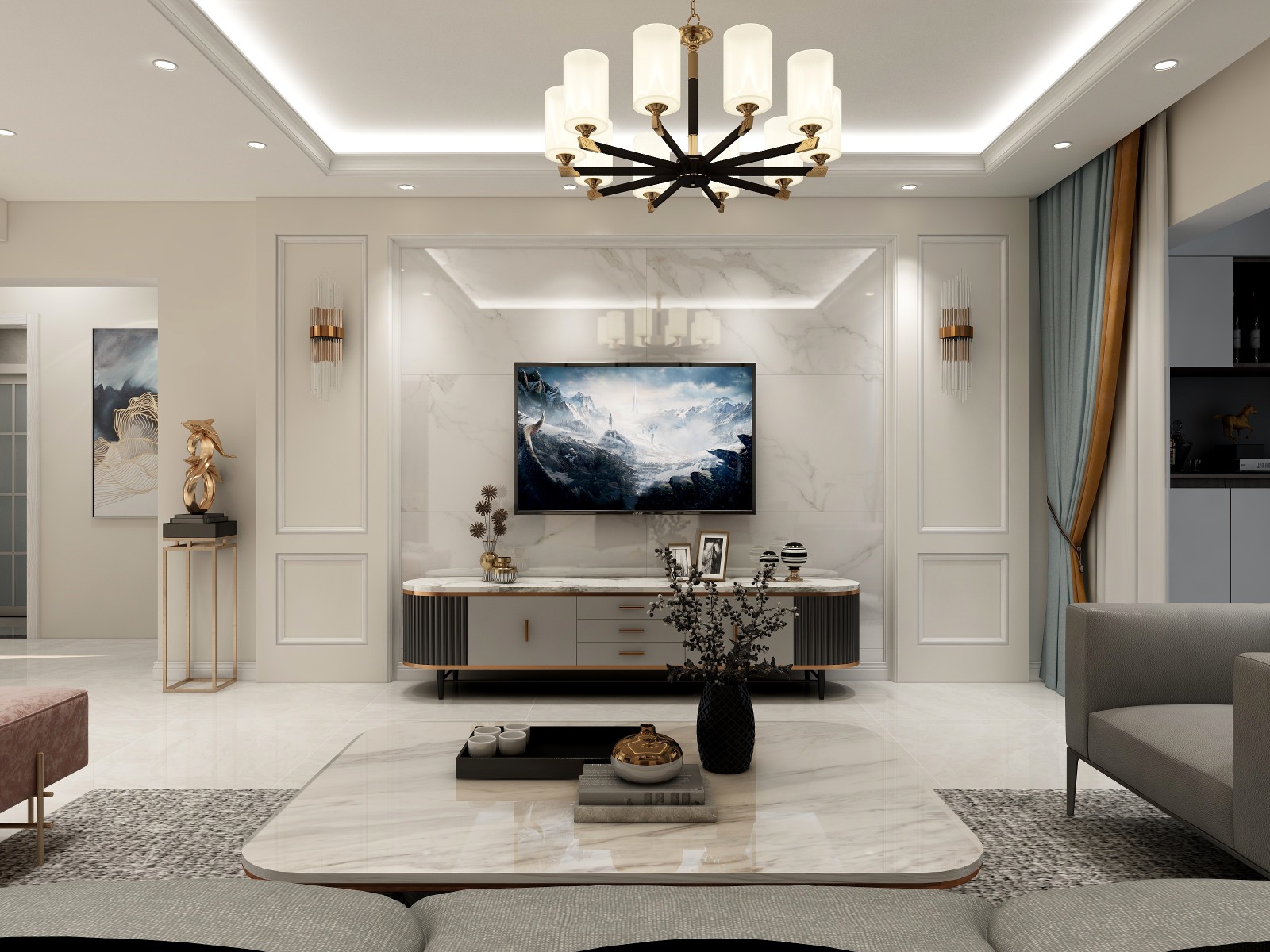 现代轻奢风,客厅背景墙通过岩板和柜体