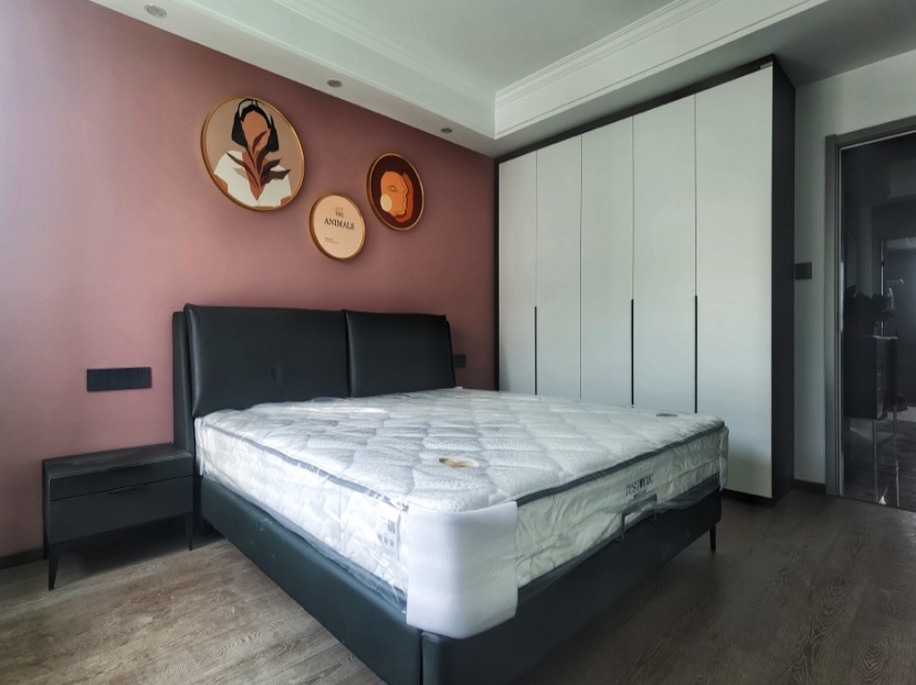 主卧墙面用乳胶漆刷成红色,整个卧室明亮温暖。