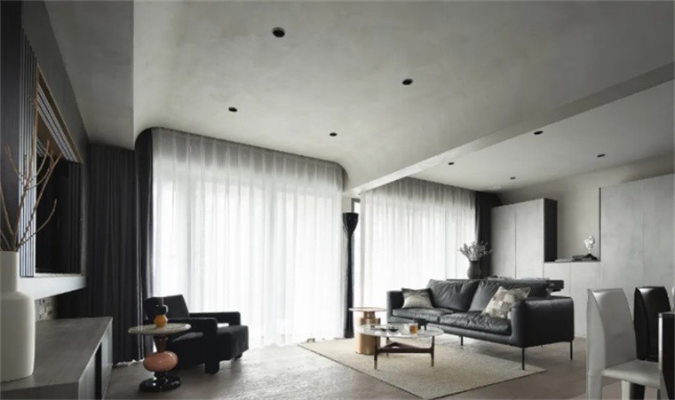 客厅与开放式书房形成横厅格局,全景落地窗带来***的采光,水泥艺术漆吊顶做了弧形处理,弱化承重梁的同时更具层次感