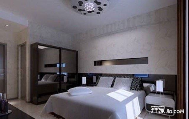 客厅造型吊顶简单大方,黑色的线条,提升了整体的格调,金属吊灯带来轻奢;灰色沙发因为简约的橙色圆凳、现代风的单人沙发与玻璃茶几组合出素雅。 卧室