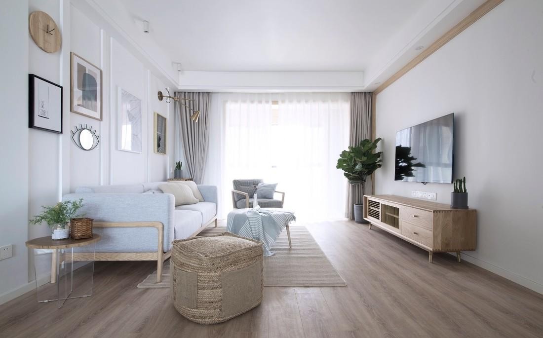 客厅整体设计从日式和北欧的干净简约出发,在软装上对这两种风格做了呼应,利用棉,麻及原木等天然材质,烘托出客厅自然、轻松的氛围。