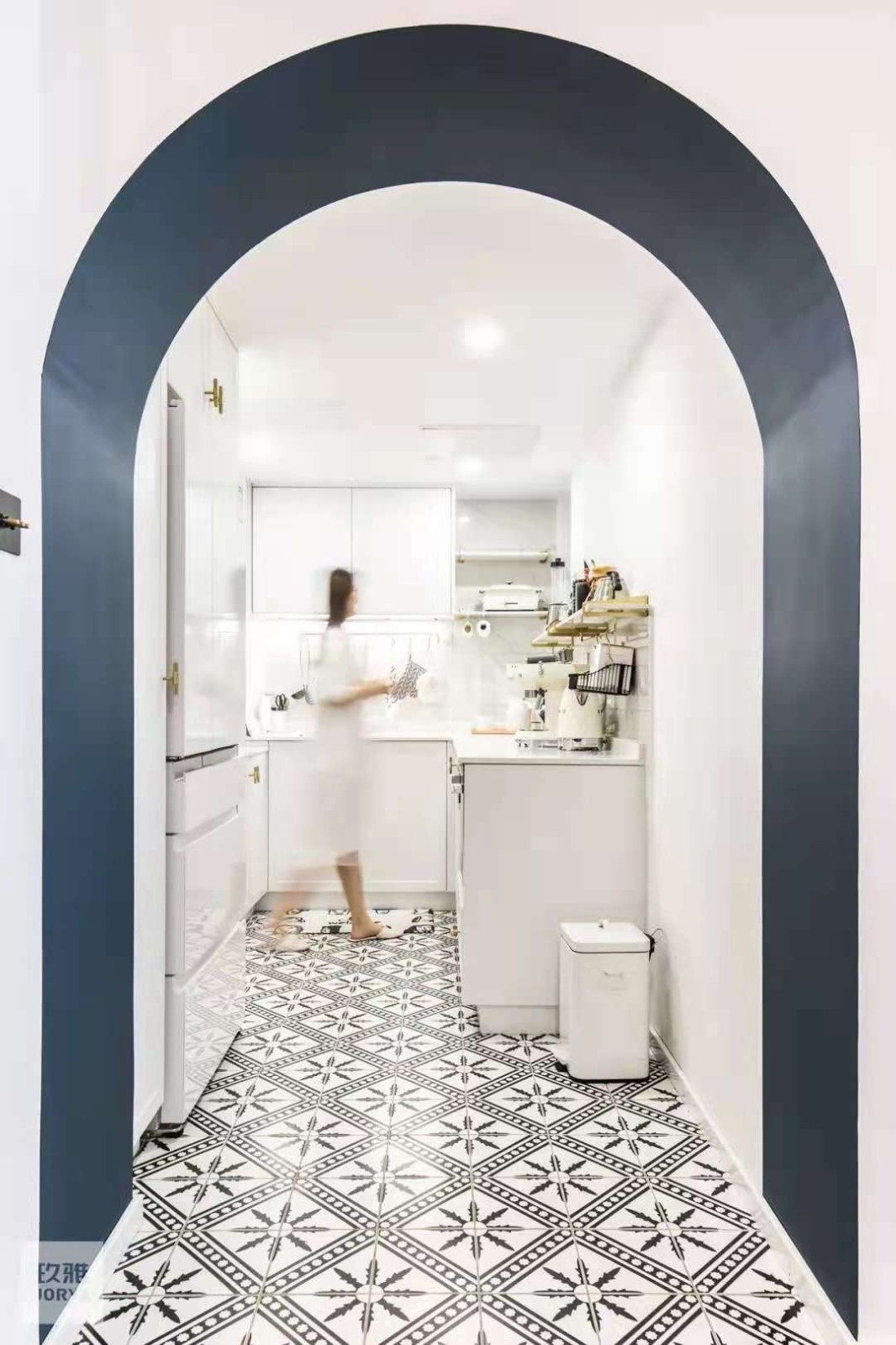 厨房入口的拱形门洞,400毫米门洞会显示有点厚重,设计师采用了逆向思维,把门洞刷成夜幕蓝,走进厨房十分具有仪式感。