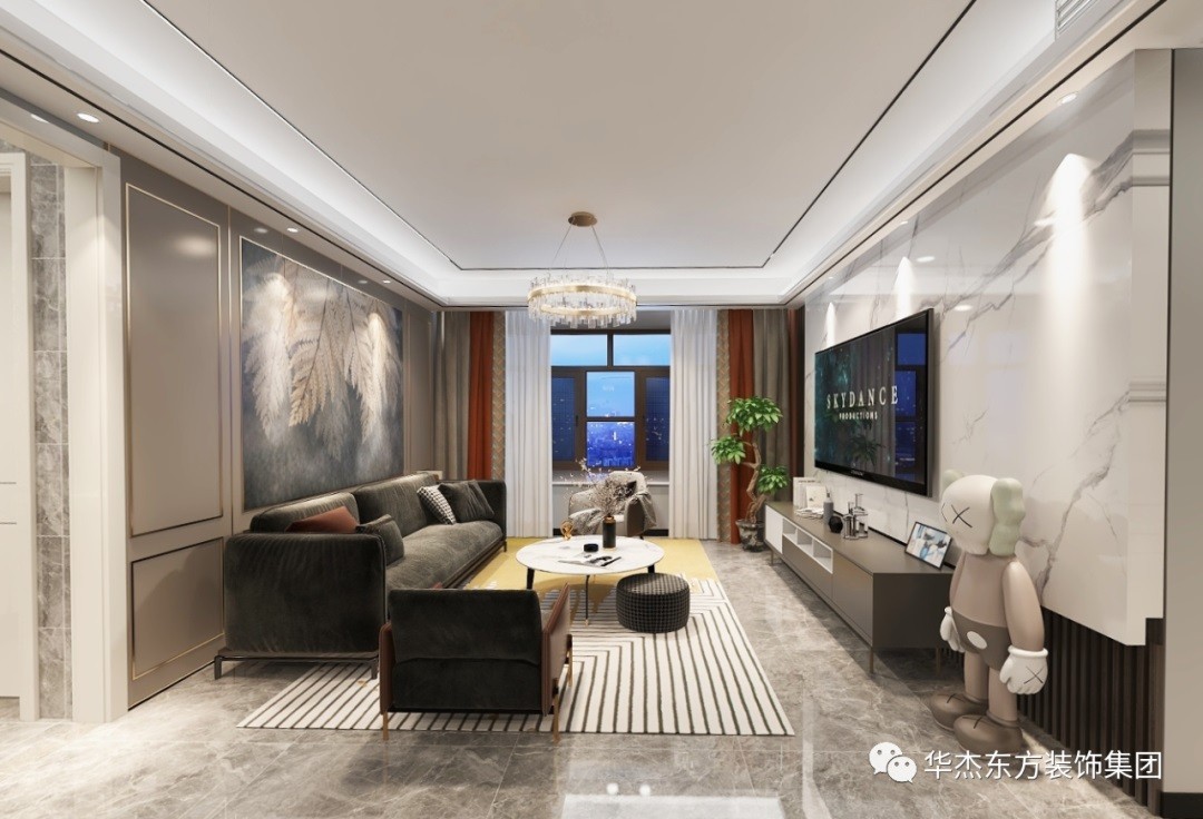 △ 沙发背景墙采用奶灰色硬包,搭配氛围感十足的大幅装饰画,同时应用金色不锈钢条作边线处理,既让不同材质的结合有关联性,又以其独特的色彩与质感赋予空间轻奢韵味。