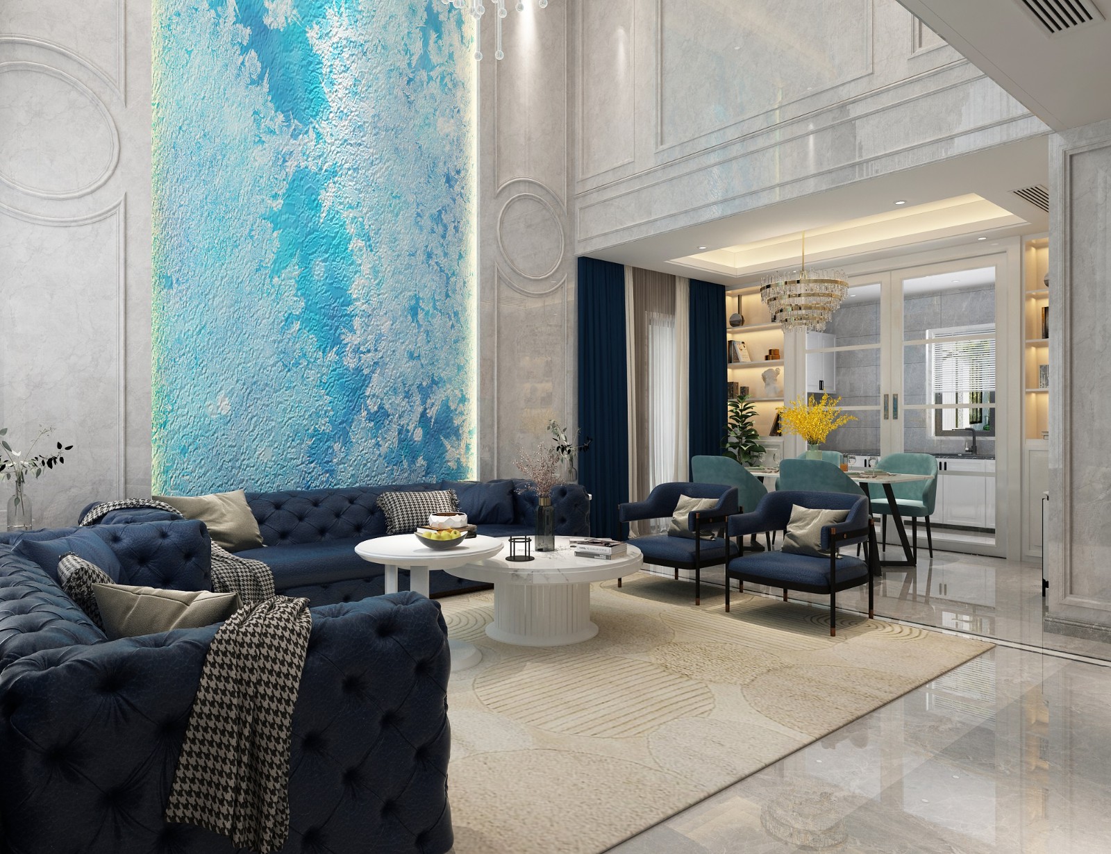 客厅中空设计,高端大气上档次!全屋做中央空调,鲜风系统 大理石立柱造型,轻奢铜+水晶灯搭配。做了中空视野更加开阔。