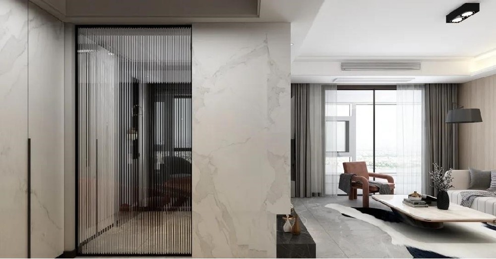 入户大开大合的收拢了就餐区,再通过透而不显的格栅柜,延伸到楼梯间